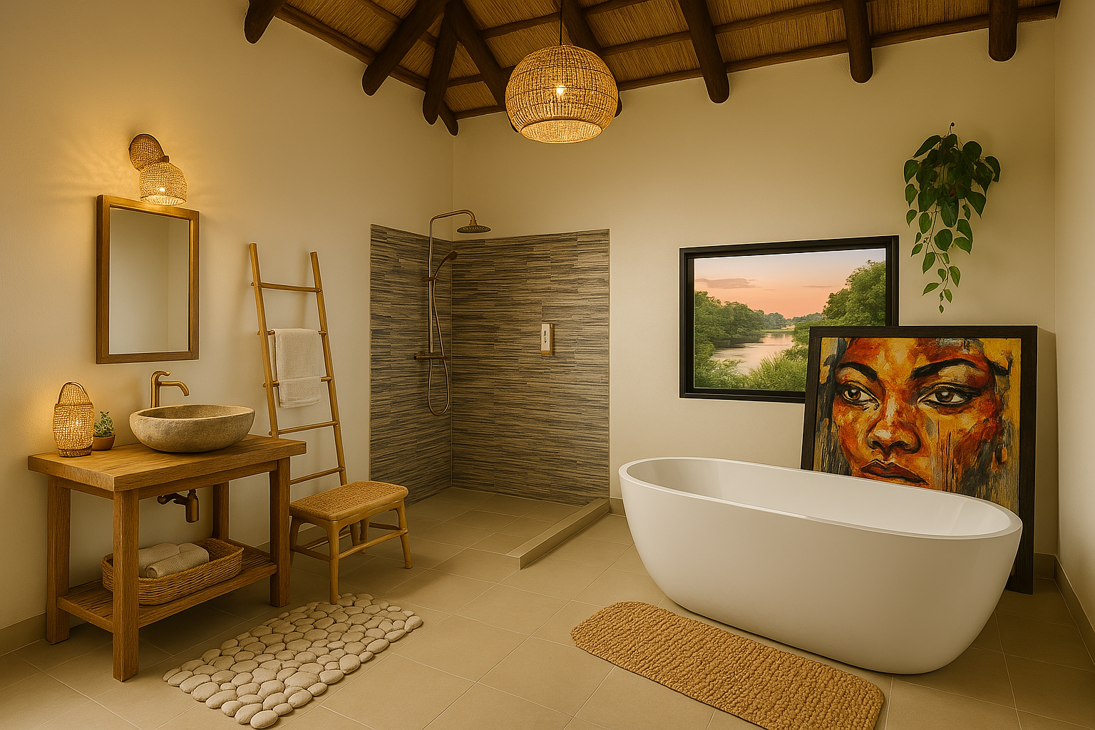 - Indulge in a spacious bathroom that blends luxury with the outdoors. Enjoy a walk-in shower or soak in the freestanding bathtub as the Lower Zambezi breeze flows through screened, glass-free windows — a refreshing touch of wilderness with every rinse.